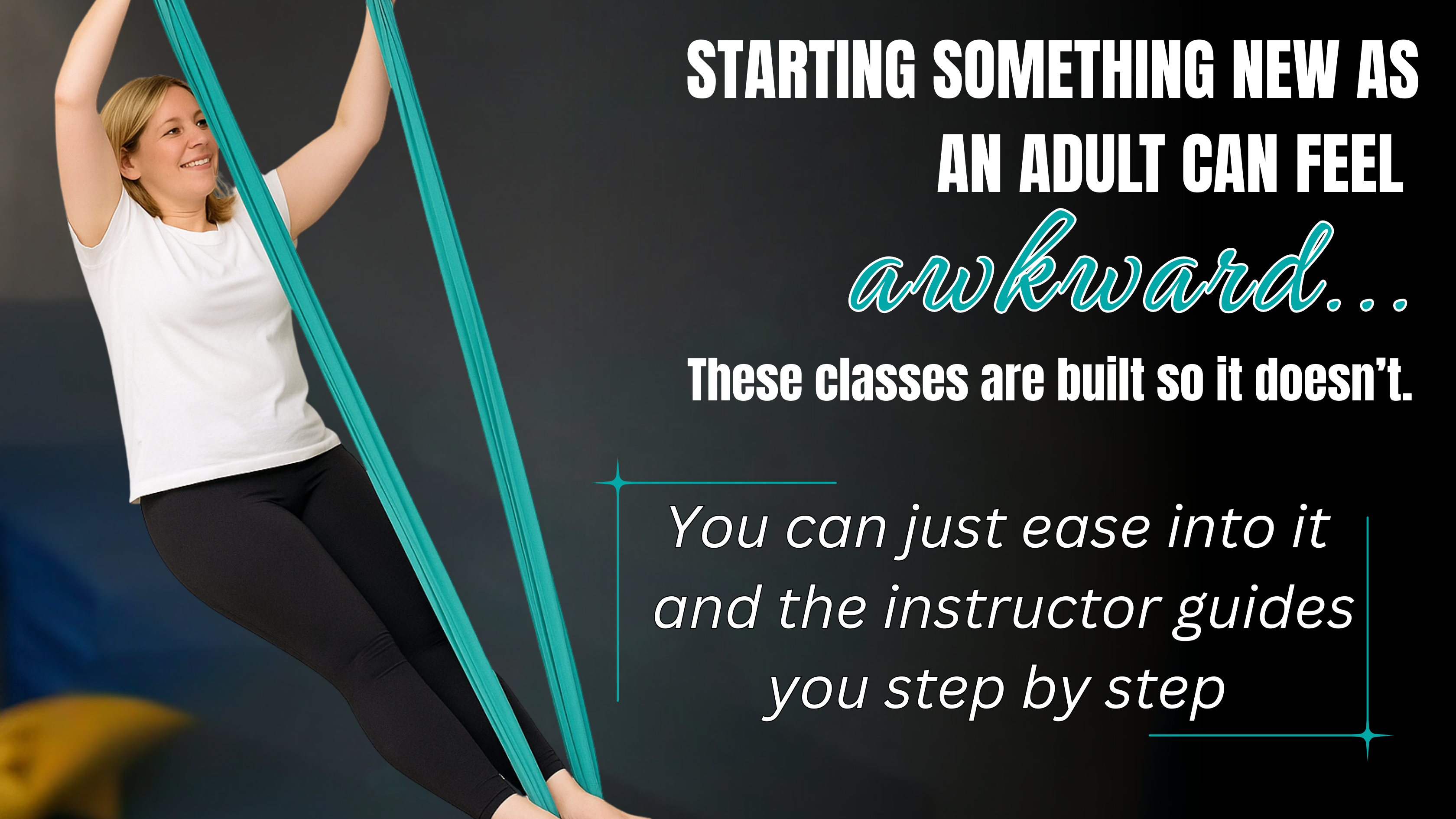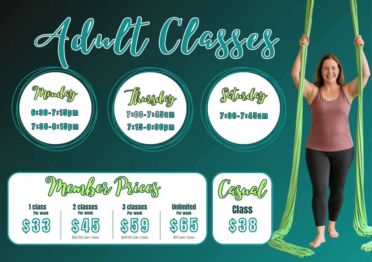 Our adult aerial classes are open to women aged 18 and over. We have a mix of women in their 20s through to their 50s — so no matter where you’re at, you’ll fit right in.